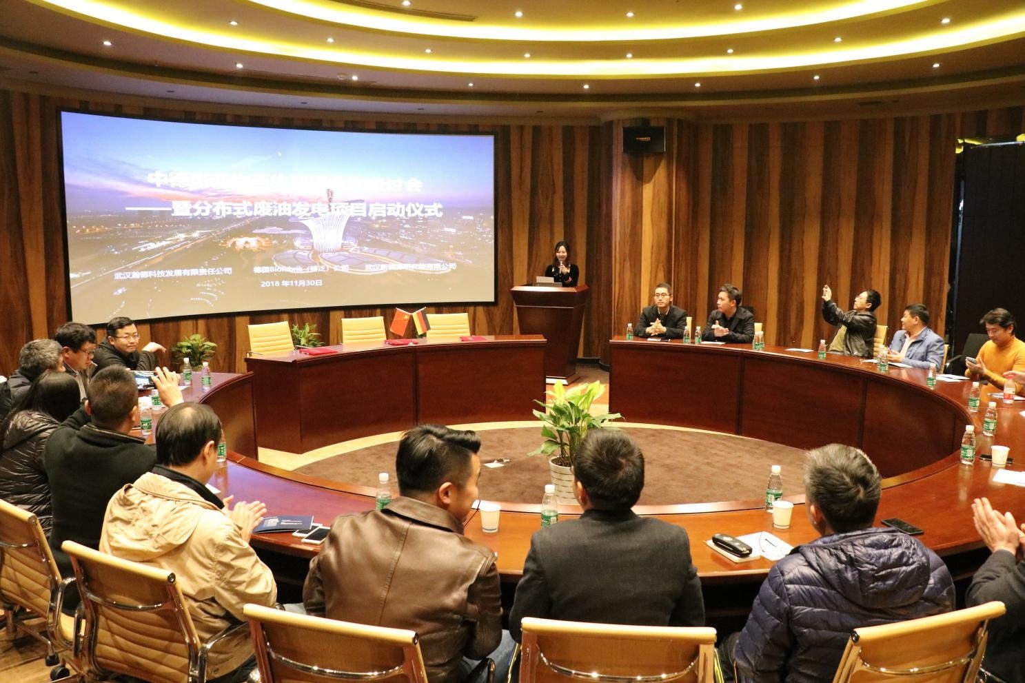 本次研討會(huì)旨在共同交流新能源產(chǎn)業(yè)在創(chuàng)新設(shè)備的開發(fā)和銷售等方面的機(jī)遇與挑戰(zhàn)。會(huì)上,與會(huì)嘉賓積極提問,奧利弗·里德爾就分布式廢油發(fā)電項(xiàng)目涉及的環(huán)境保護(hù)、設(shè)備標(biāo)準(zhǔn)和知識(shí)產(chǎn)權(quán)等話題作了具體介紹和初步探討。最后,湖北省汽車流通協(xié)會(huì)常務(wù)副會(huì)長羅吉文上臺(tái)對(duì)會(huì)議作出總結(jié)講話,表達(dá)了分布式廢油發(fā)電項(xiàng)目可以應(yīng)用于武漢的許多領(lǐng)域解決廢燃料產(chǎn)生的環(huán)境污染和再生能源等問題,并與德方代表共同展望了新能源再生設(shè)備的未來可持續(xù)方向。